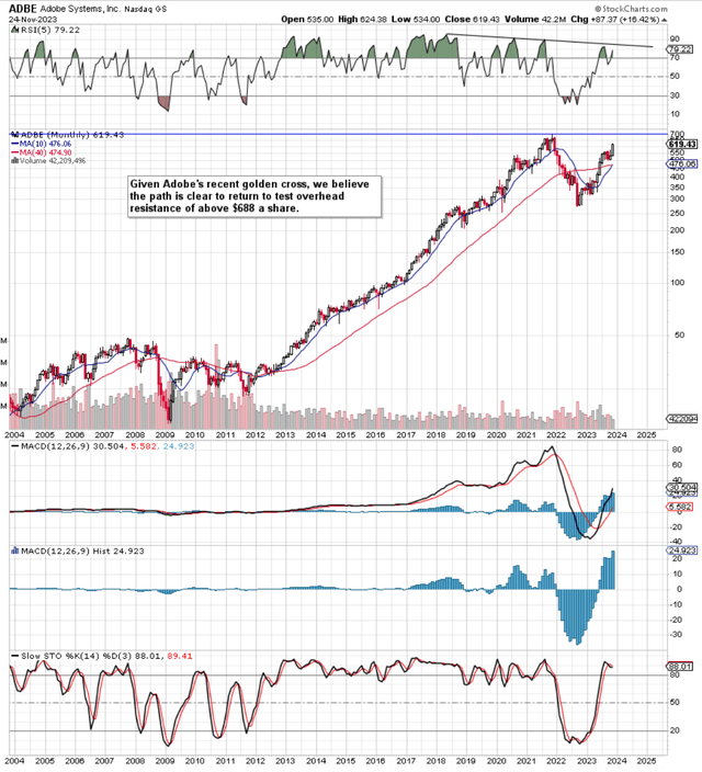 如果我们调出 Adobe(NASDAQ:ADBE )的长期图表,我们会发现自 2011 年以来,长期投资者尤其获得了非常丰厚的回报。此外,该股票在去年 9 月为投资者提供了绝佳的机会由于股票在过去 14 个月里的回报率远超 100%,他们加大了投资力度。此外,Adobe 的 10 个月移动平均线最近刚刚成功突破其相应的 40 个月平均线,这一事实是一个强烈的信号,表明该股至少应该测试其历史高点(2021 年末接近每股 700 美元)。现在的举动。长期移动平均线黄金交叉总是提供持续的动力,因此投资者至少在短期内应该继续看到 ADBE 的上涨。从技术上讲,真正的问题是股价是否具有突破该阻力位所需的动力。Adobe 的长期 RSI 动量指标确实存在轻微的看跌背离,因此看看当前的趋势走势或另一个周期是否会出现新的突破将会很有趣。