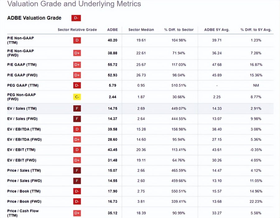 尽管有人可能会说 Adobe 的非公认会计原则市盈率与历史平均水平相符,但该公司的销售额、资产以及现金流都落后于历史平均水平一段距离,这对于股价持续升值而言,又是一个令人担忧的趋势。上述“资本分配”活动与我们在 Adobe 高于平均水平的现金流倍数中所看到的情况相关,因为该公司并未从其报告的收益中赚取那么多现金(分配)。请记住,资产和销售(按此顺序)是盈利增长的根本原因,因此从长期角度来看,尽可能便宜地购买它们是有意义的。然而,远期账面倍数和销售倍数(分别为 17.90 和 14.55)都领先于我们在Adobe所习惯的水平,在近年来资本回报率实际负增长的环境下,这再次令人担忧。