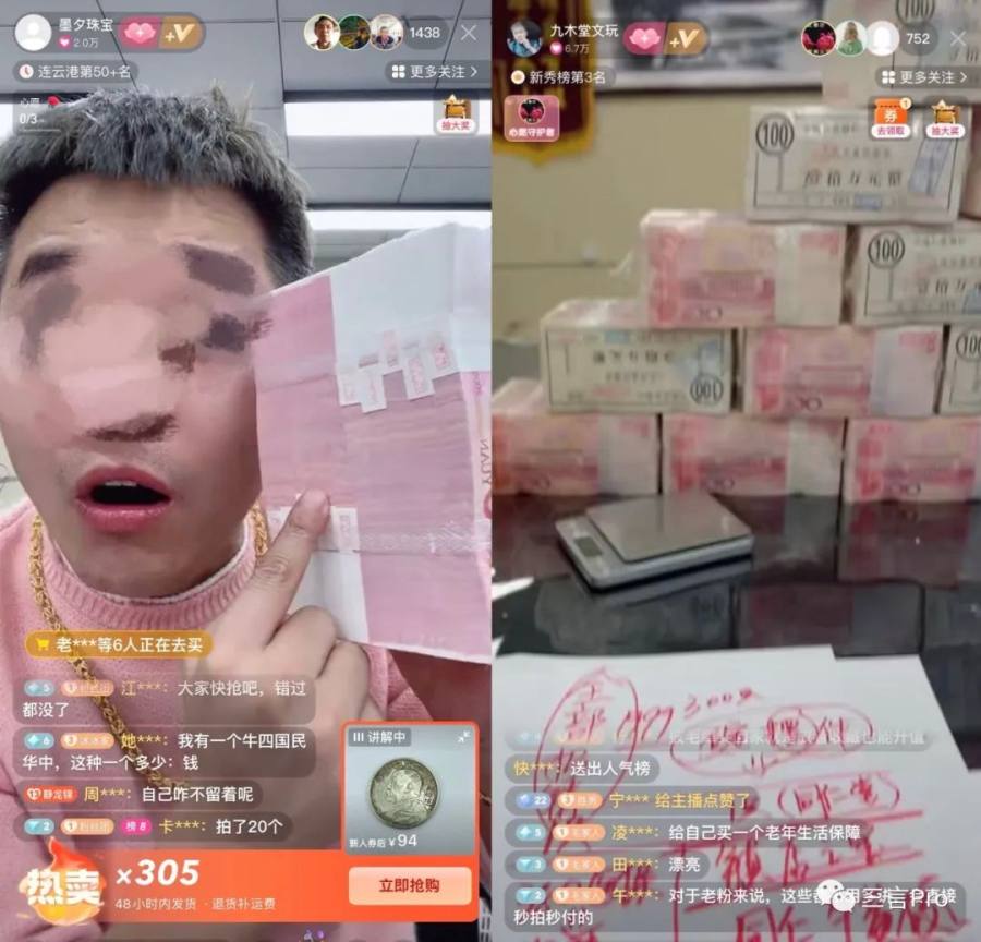 很多这种直播间,为了证明自己的“钞能力”,都会在桌上摆满人民币: