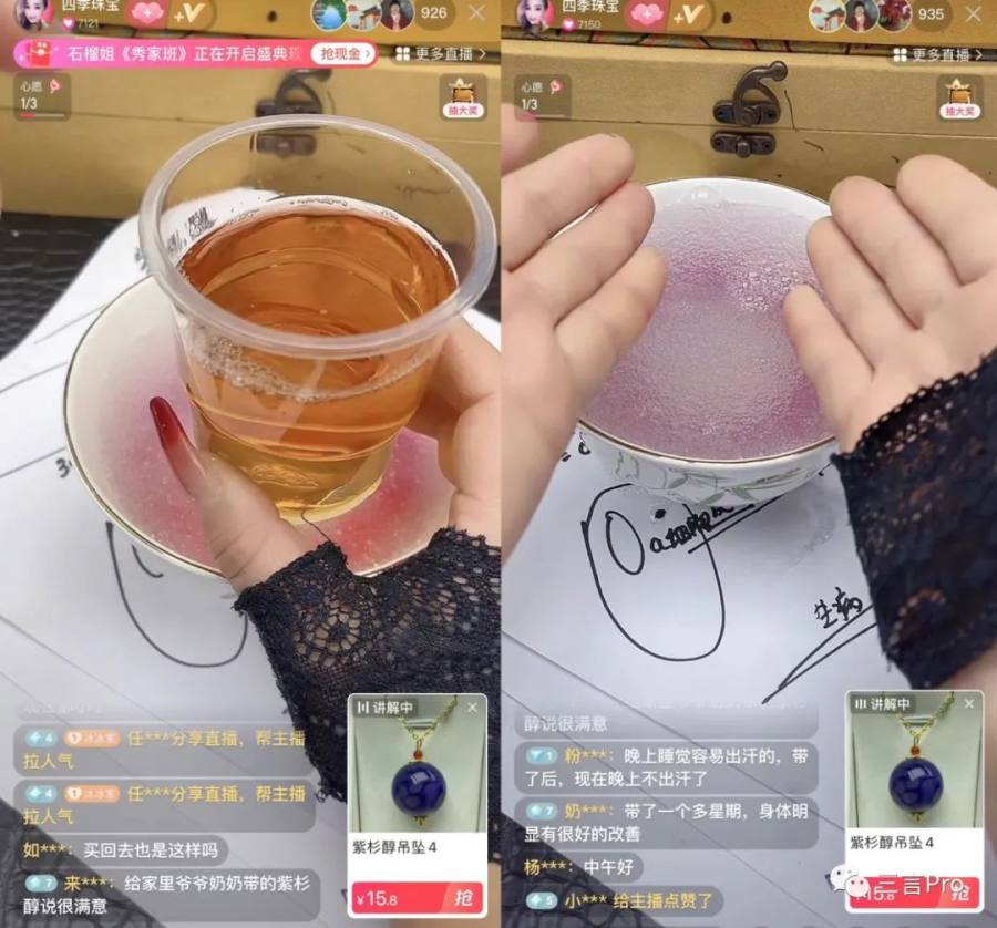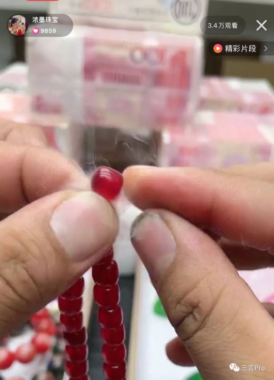 还有主播展示自己售卖的珠串,可以泡水里渗出类似血一样的颜色。