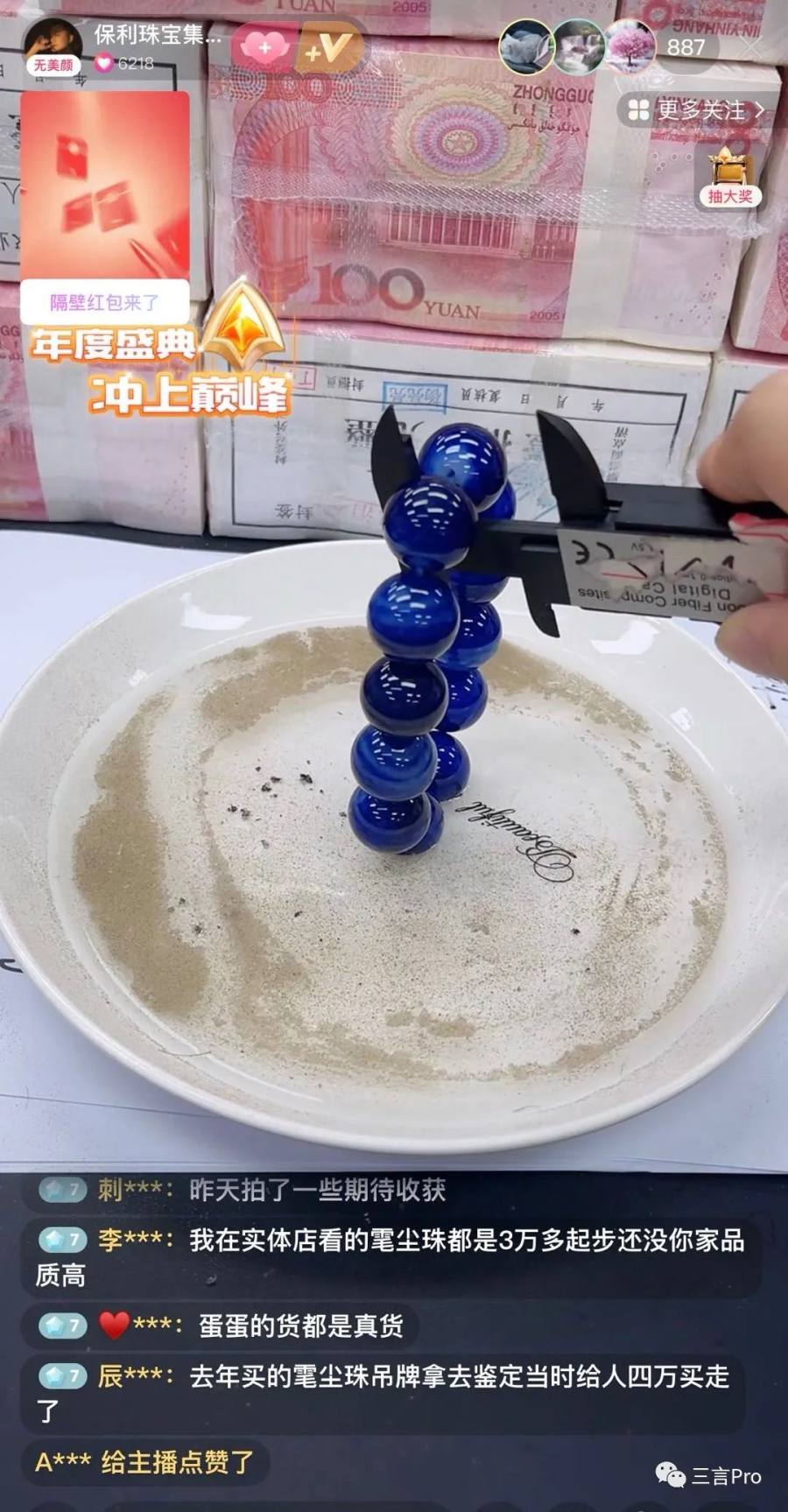 主播在直播间兜售各种价位不等的文玩、手串,称其为“雮尘珠”以及“避尘珠”。这些商品价格便宜的几十、几百元,贵的则上千近万元。