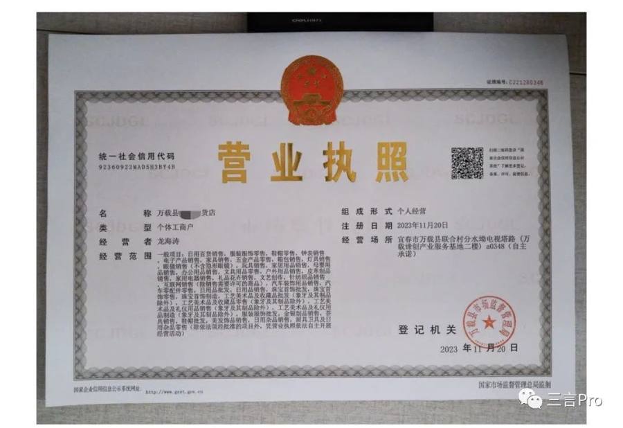 “墨夕珠宝”直播间关联的小店营业执照显示,其是一间名为“万载县通X迈百货店”的个体工商户。