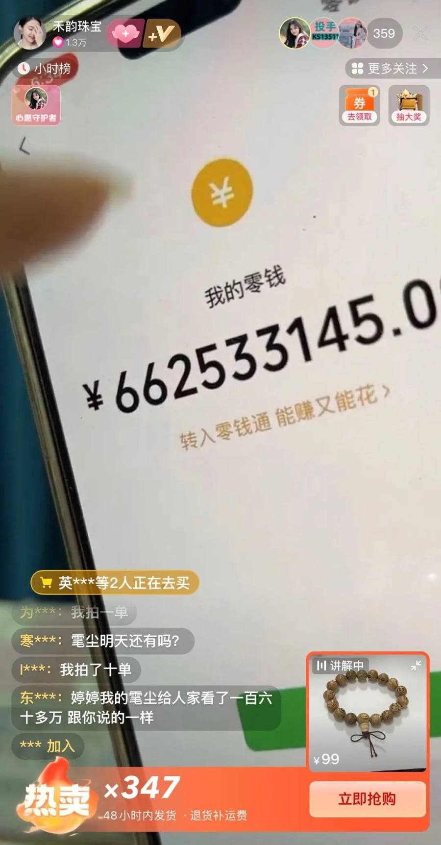 上面是主播销售一款标价99元的文玩手镯,同时,他承诺只要在直播间购买10单以上,那么会在未来会以5万元回收。下单越多,越优先回收。