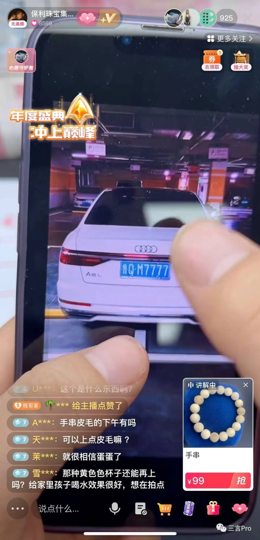 主播还宣传自己给老父亲买了奥迪A8,车牌号都是“7777”的豹子号。”主播自己开劳斯莱斯。不过在展示时,主播的手机弹出了拼车群消息“临沂拼车100元一位”。
