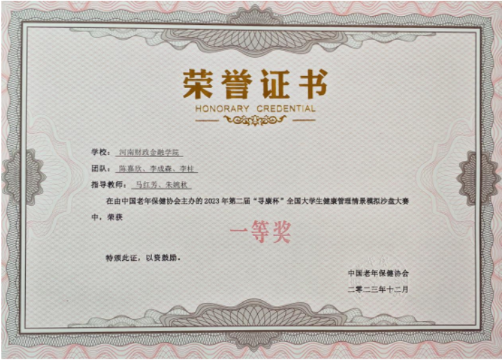 12月9日至10日,由中国老年保健协会主办,中国老年保健协会老年疾病与健康管理分会、上海市医学伦理学会护理分会、上海健康医学院承办的第二届全国健康服务与管理教育论坛暨“寻康杯”全国大学生健康管理情景模拟沙盘大赛在上海健康医学院举行。河南财政金融学院2021级健康服务与管理专业陈嘉欣、李成森、李柱三名学生组成的“财华金显队”荣获大赛一等奖,指导教师马红芳老师、朱婉秋老师获评“优秀指导教师”。健康服务与管理专业2023届学生李雨琳的《健康膳食模式与认知障碍类疾病发生风险关联的Meta分析》获优秀论文一等奖,张远的《大学生营养素养现状调查及影响因素分析》获优秀论文二等奖,牛嘉敏的《郑州市高校学生健身类APP使用现状及影响因素分析》获优秀论文三等奖。