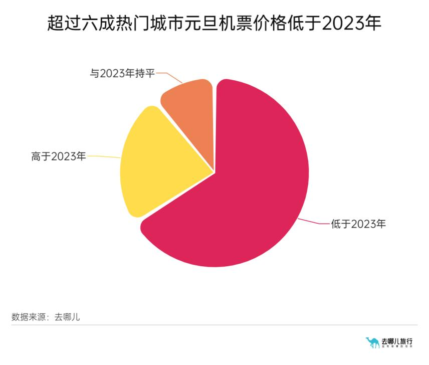 来自去哪儿网平台的数据也印证了这一特点,2024年元旦期间,其平台国内热门城市机票预订量同比2023年增长七成,而从价格维度看,元旦假期期间预订量前100名的热门城市中,超过六成目的地的机票价格低于2023年元旦。