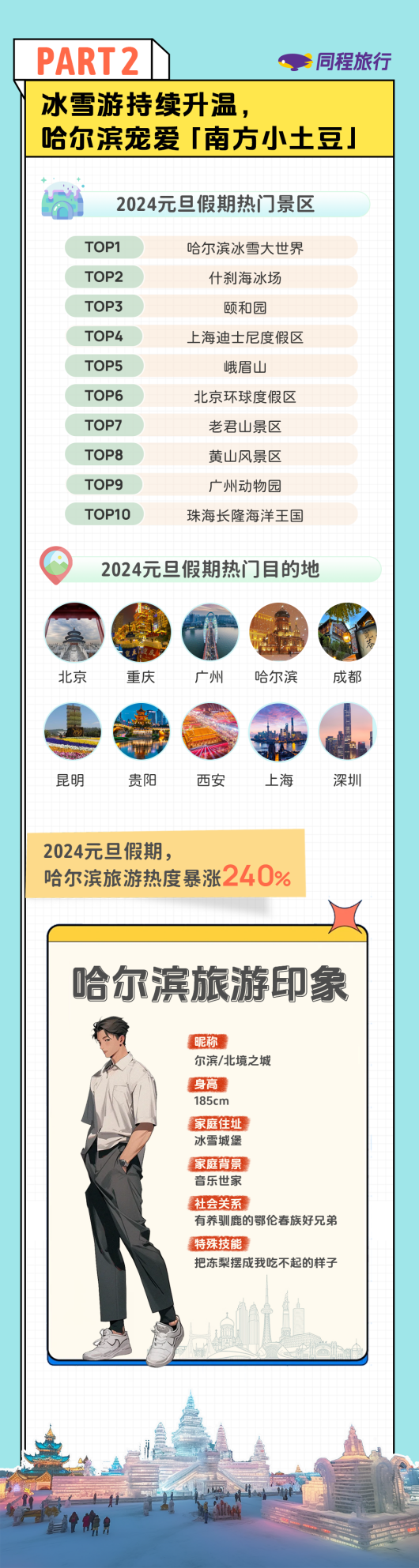 付出总会有回报,哈尔滨的热情也在吸引更多南方游客前来打卡体验,据同程旅行数据显示,2024年元旦假期,哈尔滨旅游热度环比上涨240%,在全国目的地旅游热度榜单中排名第四,预计当地旅游热潮还将延续至寒假和春节假期。