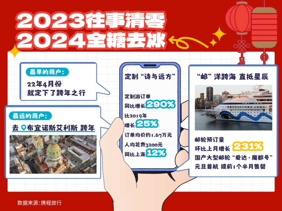 此外,随着各大邮轮开始重启中国出发航线,今年元旦假期,“久违”的邮轮游也进入人们的心愿清单。报告显示,元旦假期邮轮预订量环比上月增长231%,国产首艘大型邮轮“爱达·魔都号”元旦首航的船票,携程平台上提前1个半月就售罄了。而同程旅行相关数据也显示,2024元旦假期其平台国际邮轮游热度上涨了63%。