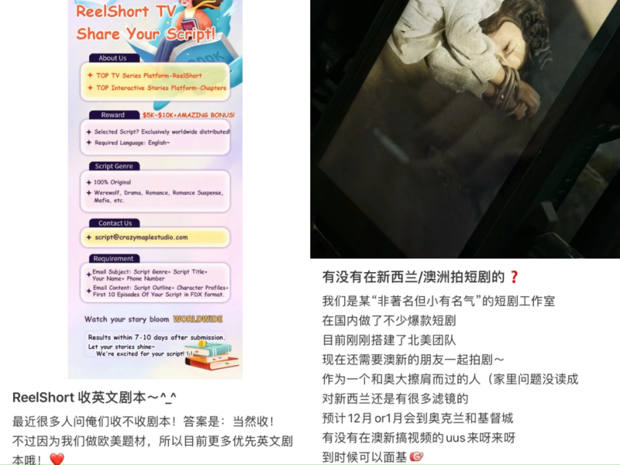 显然,前者的制作成本更高,“找人找剧本”也仍不容易。以剧本为例,而锌刻度留意到,目前有不少平台正在国内收海外短剧剧本,其中在小红书上有收稿信息显示,“中文剧本两万元,中英双语剧本三万元,10集起投”。而ReelShort官方账号也发布了英语剧本的征稿信息,“稿酬为五千元至一万元美金。”