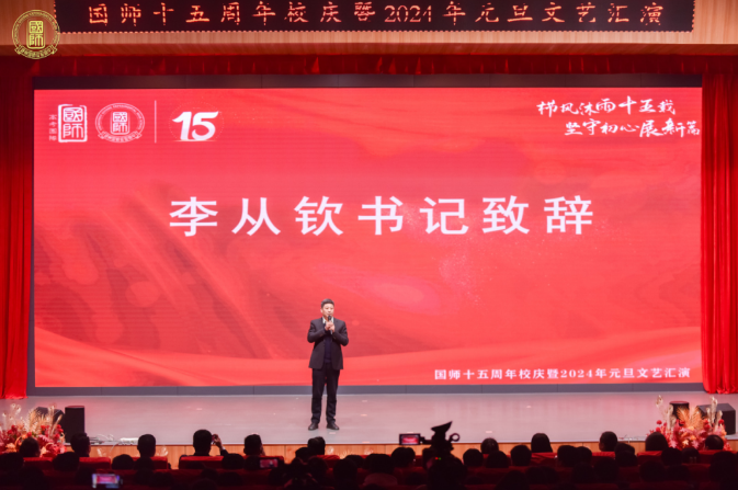 时光如梭,新岁开启。2023年12月29日晚,郑州国师“栉风沐雨十五载 坚守初心展新篇”十五周年庆典暨2024年元旦晚会在学校礼堂隆重举行。国师创始人、郑州国师实验高中党组织书记李从钦与郑州国师各校区校长、领导及郑州国师实验高中全体师生欢聚一堂,在热情洋溢的氛围中迎接新一年的到来。