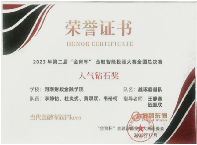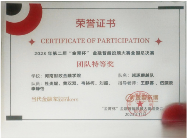 河南财政金融学院在“金育杯”金融智能投顾大赛全国总决赛中荣获团体特等奖