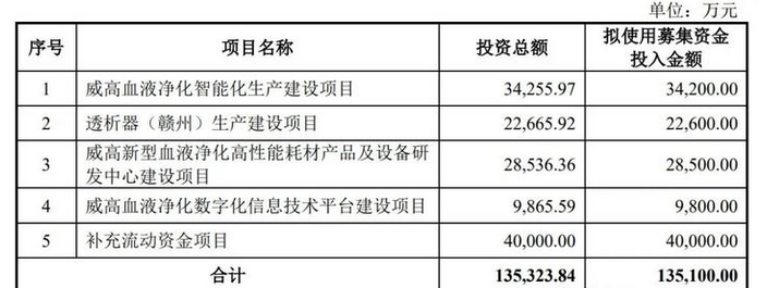 因此为了寻求更多突破,威高血净也正在将“智能化”作为重要解决路径之一。从募资用途来看,本次冲刺上市,威高血净计划募资13.51亿元。其中与智能化、信息化相关的项目建设投入占比达33%。招股书显示,威高血净计划将募资金额中的3.42亿元用于威高血液净化智能化生产建设项目,9800万元用于威高血液净化数字化信息技术平台建设项目。