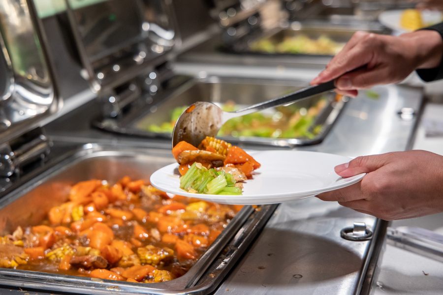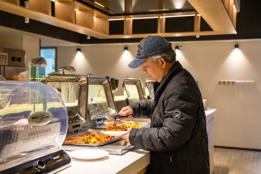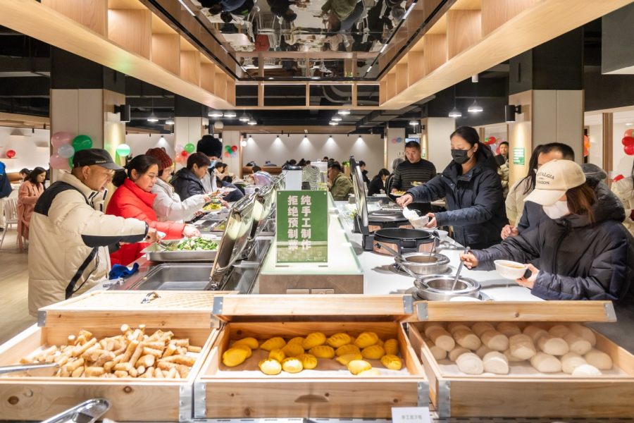 取餐处分为自助餐台与特色明档两个档口,自助餐台早餐涵盖粥、胡辣汤、豆浆、荤素包子、鸡蛋,现做面点,小炒菜等,午餐四菜两汤,辅助搭配杂粮、点心、沙拉、小菜、主食等,荤素搭配满足不同需求,且菜品一旦见底及时更换,保证美味源源不断。特色明档则以面食为主,纯手工制作,每天不定期推出刀削面、米线、捞面、拌面、小面等各色面食,晚餐可根据个人需求选购明档餐品,手工馄饨、饺子、丸子汤等。