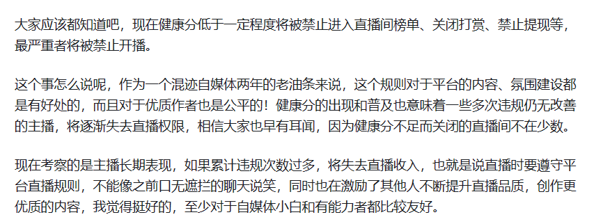 如今该新规已实行两周有余,不少主播不得不改变,表示“都不会说话了”,也有主播晒出经专业主播申请得到的“120分最高分”。而从用户端来看,与新规相关的讨论区,大多对此持认可态度,其中不乏“早就该整顿了”“低俗的太多了,确实该管管”的评论。不过,也有不少用户认为规则总会有漏洞,“实际意义不大”。