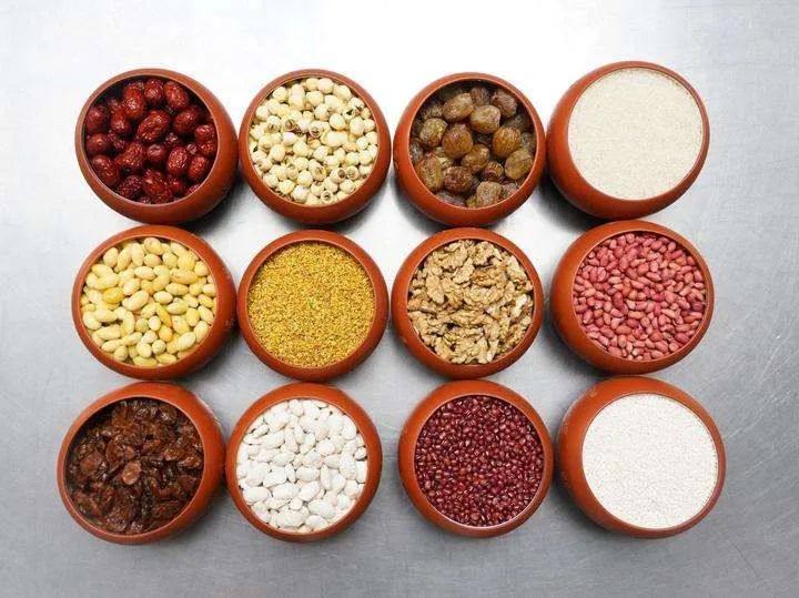 在《燕京岁时记》中有记载:“腊八粥者,用黄米、白米、江米、小米、菱角米、栗子、红豇豆、去皮枣泥等,合水煮熟,外用染红桃仁、杏仁、瓜子、花生、榛穰、松子及白糖、红糖、琐琐葡萄,以作点染。”