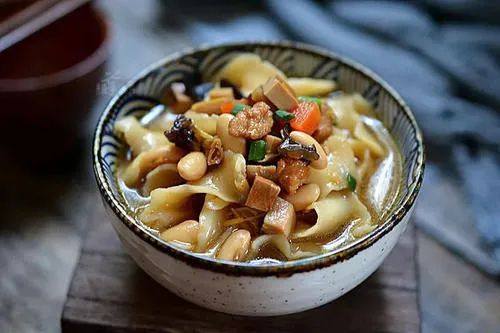 在腊八前夜,把面粉擀成韭叶面,将红豆泡一个晚上,再用各种果蔬做成臊子。