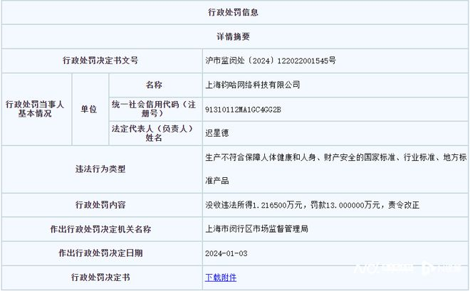 而上海钧哈网络科技有限公司并非首次因为质量问题被罚。上海市市场监督管理局曾披露,2023年1月30日上海钧哈网络科技有限公司曾因为涉嫌销售不合格电动车而遭到行政处罚,被罚款36.6149万元,没收违法所得1.4755万元,总计罚没38万余元,并被责令停止违法行为,限期改正;同月,烟台市市场监督管理局网站公布了《烟台市市场监督管理局2022年第一批产品质量市级监督抽查结果公示》。抽查结果显示,本次不合格产品总共34批次,其中1批次由上海钧哈网络科技有限公司生产的“棒途”电动自行车不合格。