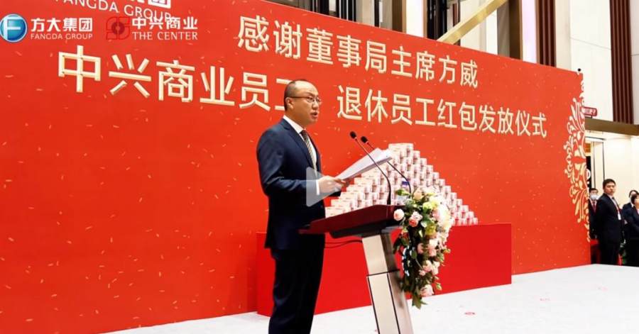 视频显示,仪式现场摆放着一摞高高的现金墙,员工依次上台领取了自己的现金红包。红色的背景板上,写着“感谢董事局主席方威——中兴商业员工、退休员工红包发放仪式”几个大字。