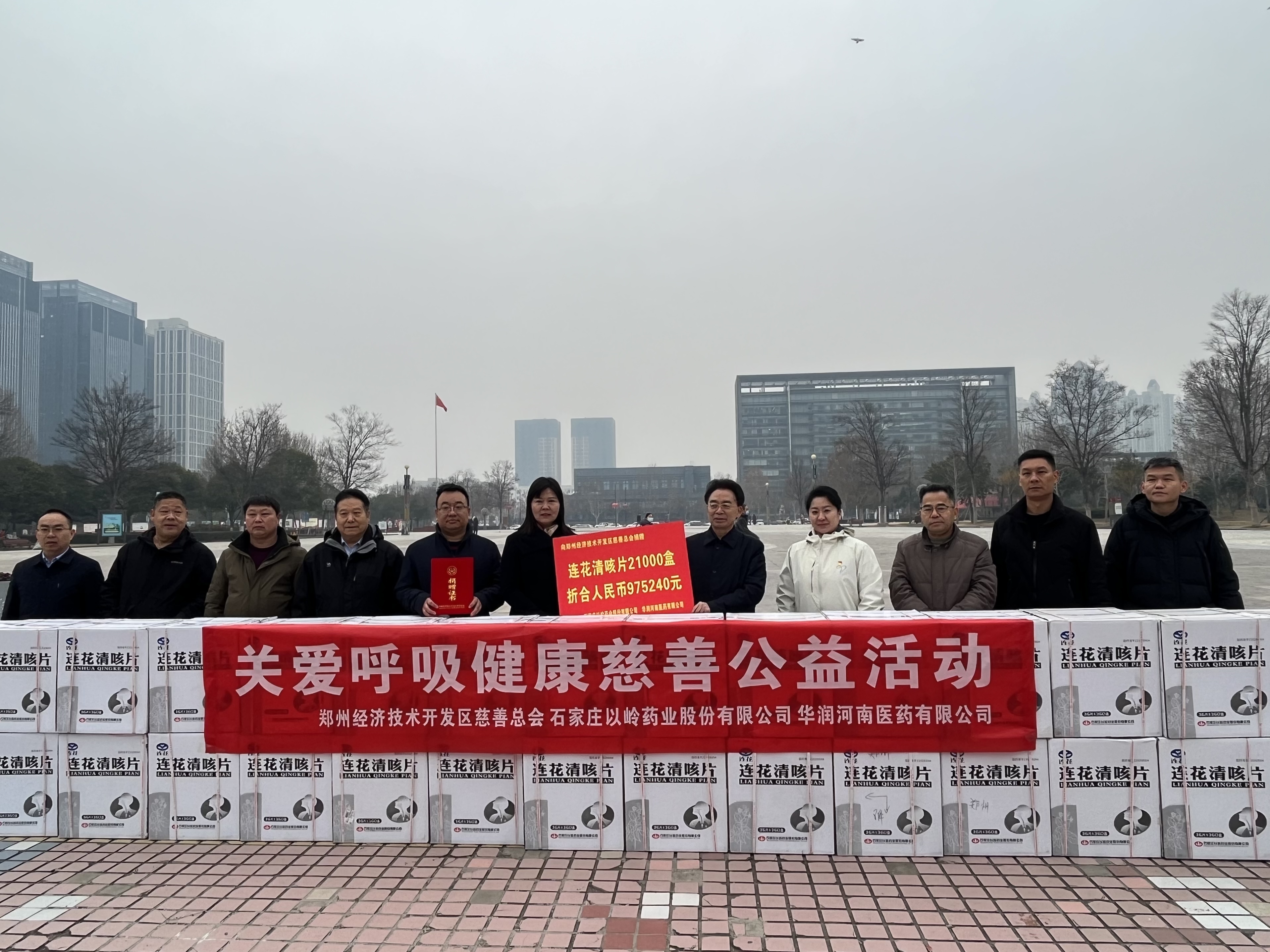 为进一步关爱群众呼吸健康,推动经开区基层卫生事业发展, 1月30日,华润河南医药有限公司、石家庄以岭药业股份有限公司向经开区慈善总会捐赠连花清咳片21000盒,价值975240元。