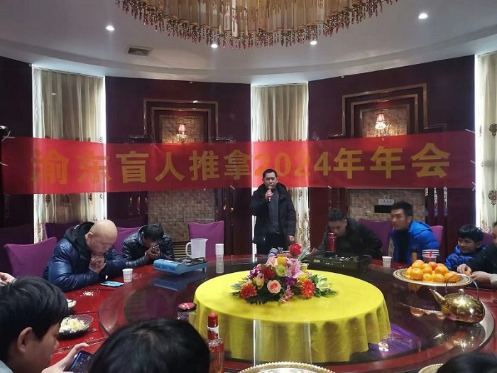 年会现场,区盲协负责人到场致辞,对渝东盲人推拿中心成立24周年,在2023年经济不景气的情况下逆袭,营业额超百万大关表示祝贺!渝东盲人推拿中心负责人秦小洪同志向所有员工提出要求,希望所有员工强化服务意识,提升技术实力,赢得市场竞争力和客户美誉度,把渝东盲人推拿中心做大做强!力争在未来几年内,让渝东盲人推拿中心品牌连锁店走出万州,总店负责人张亮、江南店负责人袁术分别就推拿技术人员在场所卫生、接待、服务、技术培训提升方面作出了细致安排。活动中,全体员工自编自导自演了丰富多彩的节目,展示了盲人技师的才艺和精神风貌!