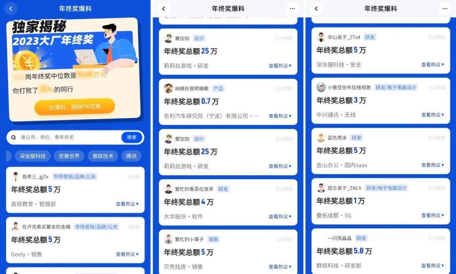 职场社区“脉脉”特别推出了“年终奖爆料”板块,用户可以主动分享自己所在的公司、岗位以及年终奖情况,供其他网友参考。