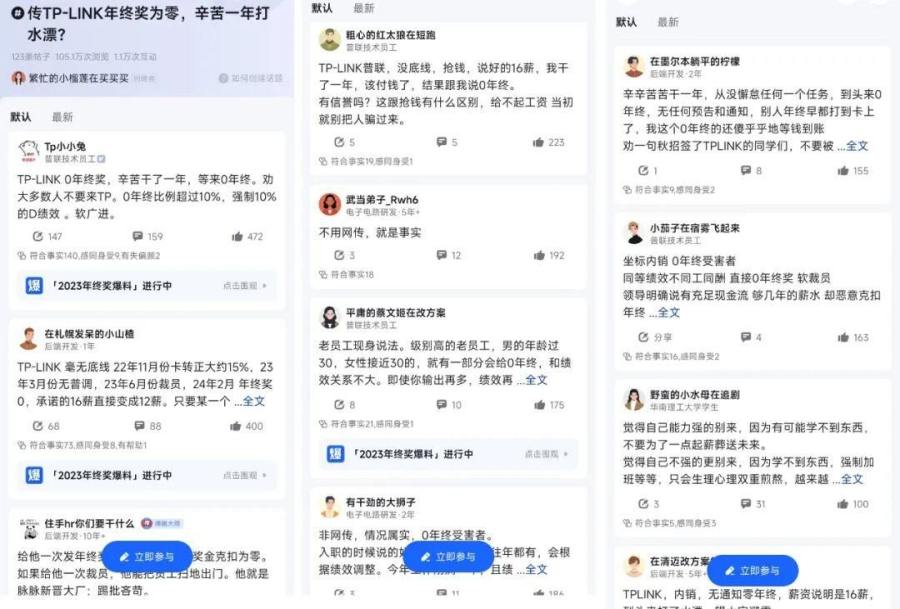 脉脉平台上,“传TP-LINK年终奖为零,辛苦一年打水漂?”的话题一度成为热榜第一。多位网友在话题下发声吐槽,称传言为真;截至2月8日上午,该话题已有超105万次浏览,1.1万次互动。