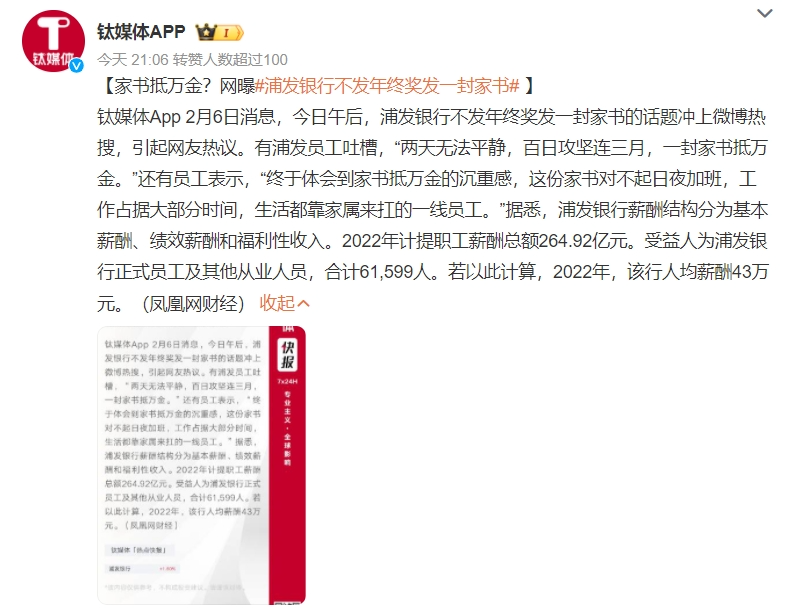 同样被“喷”上热搜的还有浦发银行(600000.SH),原因是有自称浦发银行员工的网友吐槽,称公司过年没发年终奖,而是发了一封家书,“家书抵万金”。不过浦发银行也回应称,所谓家书是给员工家属的慰问信,随信发放的还有2000元慰问金,而年终奖和慰问金不是一个性质的钱,年终奖的本质是绩效奖金。