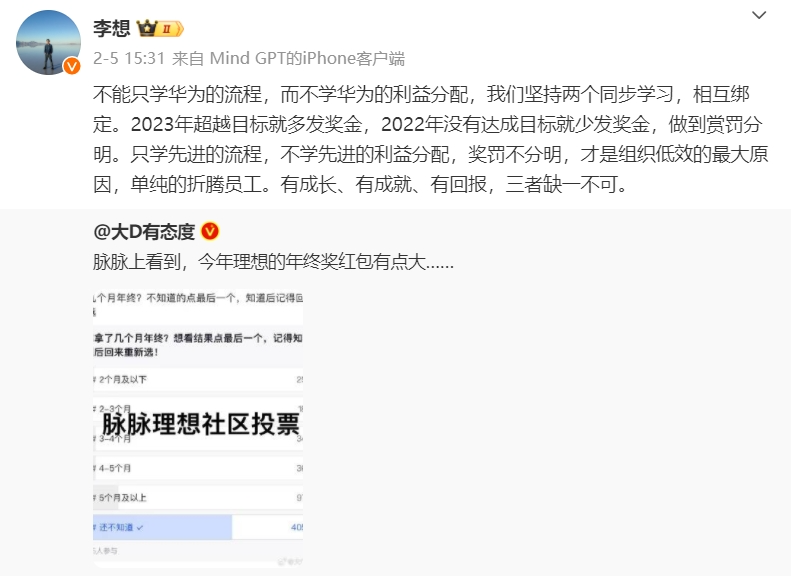 对此,理想汽车CEO李想还在微博上回应,称“不能只学华为的流程,不学华为的利益分配。2023年超越目标就多发奖金,2022年没有达成目标就少发奖金。”