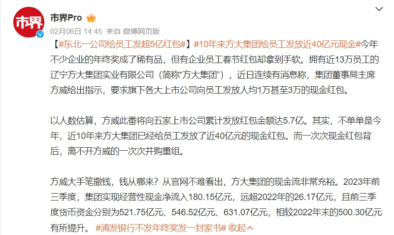 方大集团(000055.SZ)的“大礼包”也是不遑多让。近日有媒体报道称,方大集团董事局主席方威给出指示,要求旗下各大上市公司向员工发放人均1万元至3万元的现金红包;以人数估算,方威此番将向五家上市公司累计发放红包金额达5.7亿。
