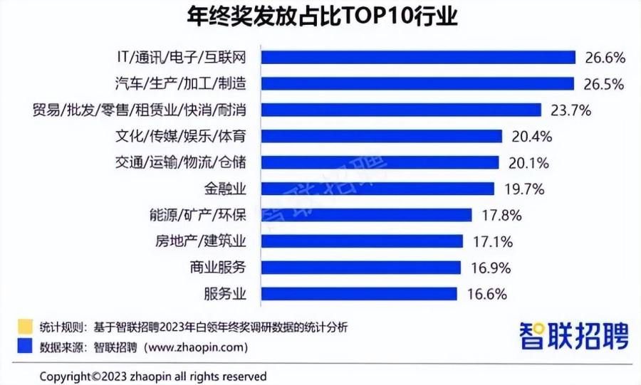 其中,IT/通讯/互联网行业白领年终奖发放占比为26.6%,位居所有行业第一;紧随其后的是汽车/生产/加工/制造行业,年终奖发放占比26.5%;最低的服务业,年终奖发放占比仅16.6%。