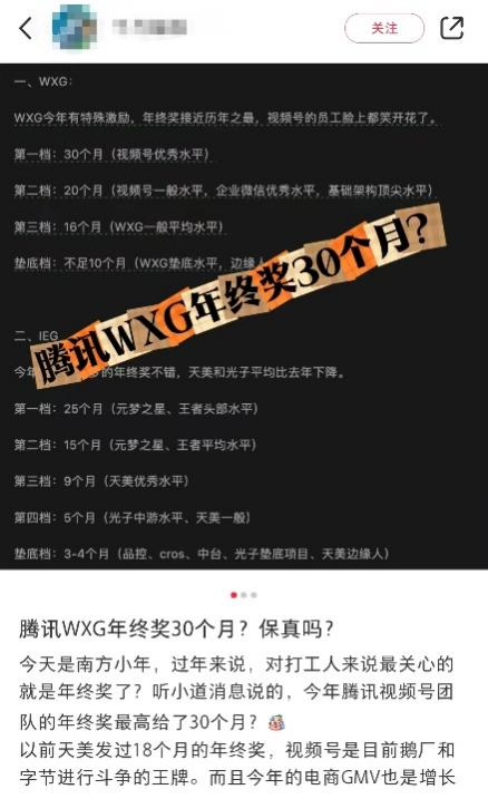 近日,一张腾讯WXG(微信事业群)年终激励的截图在社交平台广泛流传。其中显示,WXG年终奖接近历年之最,视频号员工脸上笑开了花,绩效第一档员工能获得30个月月薪的年终奖。