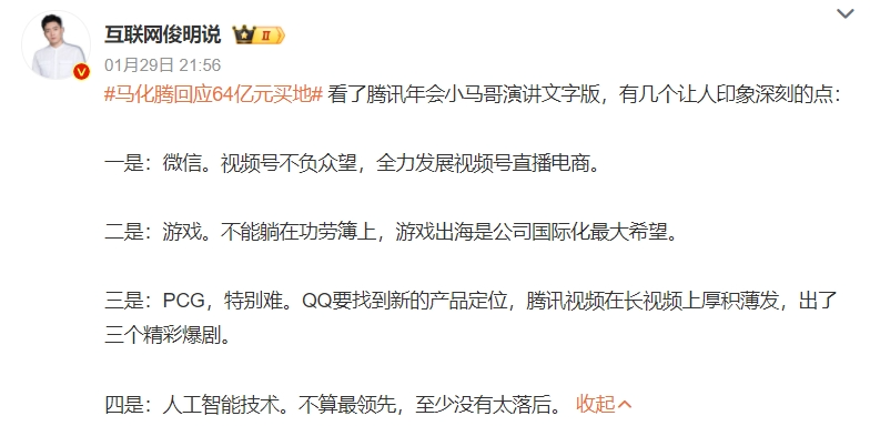 而不久前腾讯的年会上,微信视频号刚刚获得了马化腾的高度赞扬;其表示视频号的发展不负众望,“让我们在过去短视频失利的情况下,重新具备了一个坚实的抓手。”同时,马化腾也传递出腾讯今年还将全力发展视频号直播电商的信号。