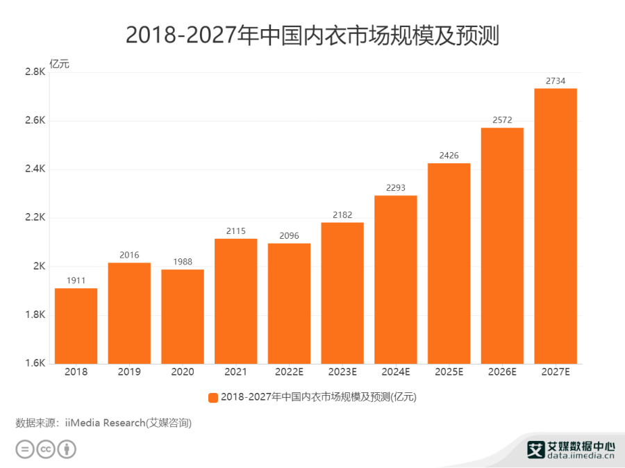 结合当前内衣行业环境来看,老品牌的转型升级日趋必要。内衣行业被视为“我国服装行业最后一块黄金市场”,iiMedia Research(艾媒咨询)报告预测,2027年我国内衣市场规模或将达到2734亿元。