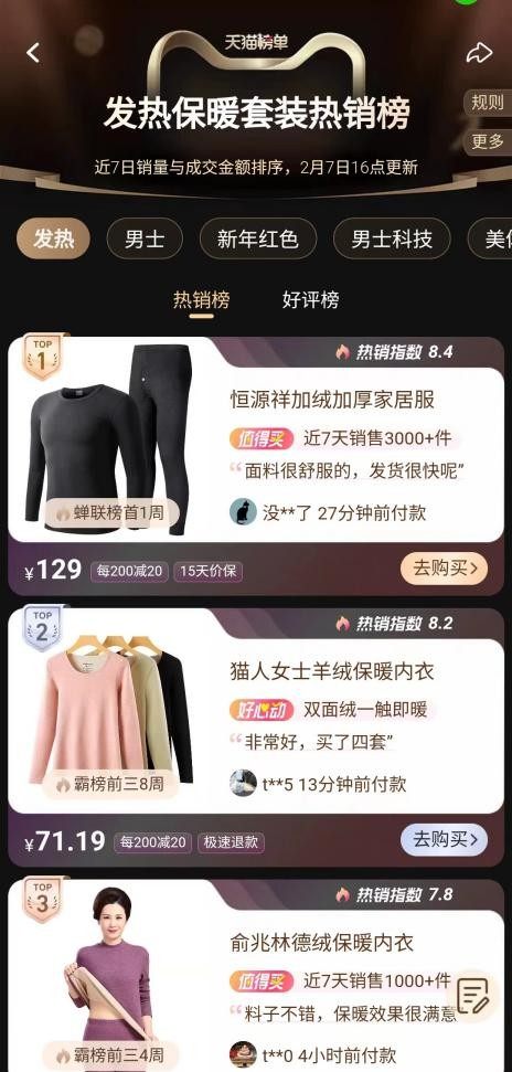 而正如前文所言,现阶段猫人等老玩家已进入产品功能升级期,高科技属性叠加性价比,强势呼应了消费需求,也必然能开拓更大的增长空间。可以看到,在天猫发热保暖套装热销榜中,恒源祥、猫人、俞兆林的性价比产品占据前三,体现了老品牌的市场影响力。