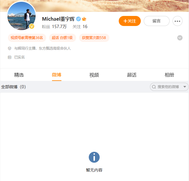 今天(2月27日)上午,董宇辉将自己的微博账号@Michael董宇辉 内容全部清空。在他的主页,目前只能看到“与辉同行主播,东方甄选高级合伙人”的认证,以及157万看不到他动态的粉丝。