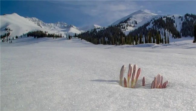 初春的空中草原冰雪逐渐消融,那拉提野百合在涓涓雪水的滋养下悄然绽放,它似乎是在告诉人们春天来得虽然曲折,但总会到的。