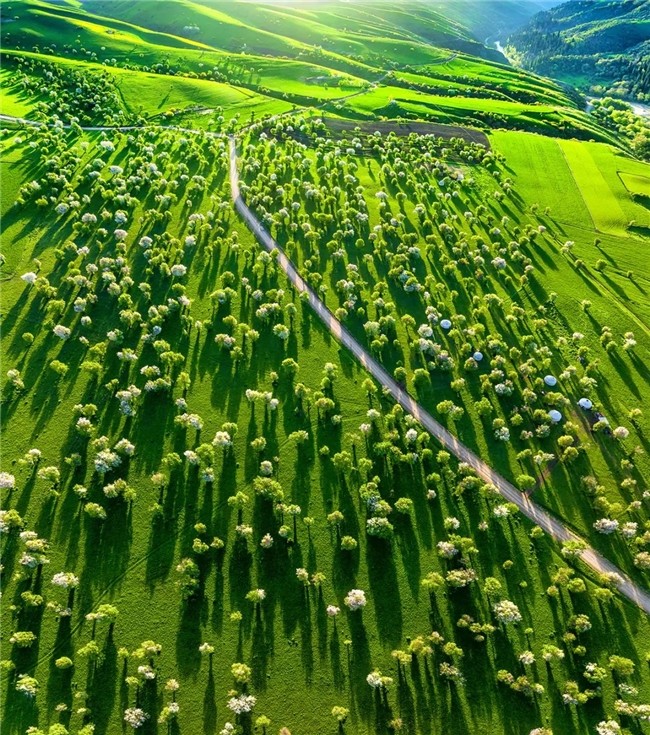 萨哈野果林:位于伊犁新源县喀拉布拉镇克孜勒塔勒村,东西长约50公里,南北宽约10公里,每年4月底5月初,万亩野果林果花竞相开放,犹如镶嵌在天山耳际的一颗翡翠,凡去过的人无不赞美大自然的神奇。