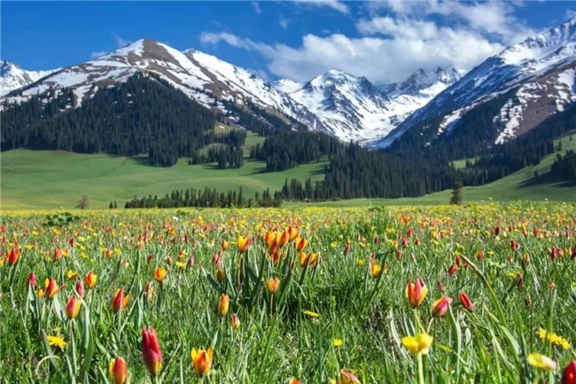 谷雨时节的那拉提草原正踏入怡人的春季,青草在成长,繁花在盛放,一派生机勃勃,美景不断,谷雨前后,正是那拉提花开的时节。