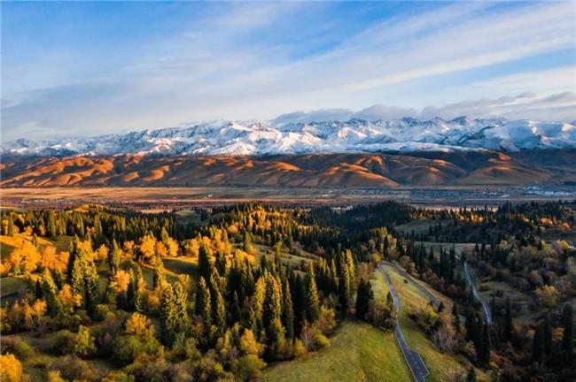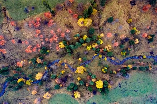 秋天一到,那拉提草原的盘龙谷,成了被打翻的画盘,五彩斑斓的墨点,纷纷扬扬,层林尽染,每一片叶子都挂上了秋色。