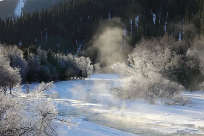 十一月,那拉提迎来初雪,从天空到草原再到山间,白茫茫浑然一片。远处的山涧、百亩云杉林,近处的巩乃斯河、次生林相映成趣,宛若一幅水墨画。冬窝子、红柳金滩、日照天山、云海观日,都是摄影爱好者喜好的冬季美景。