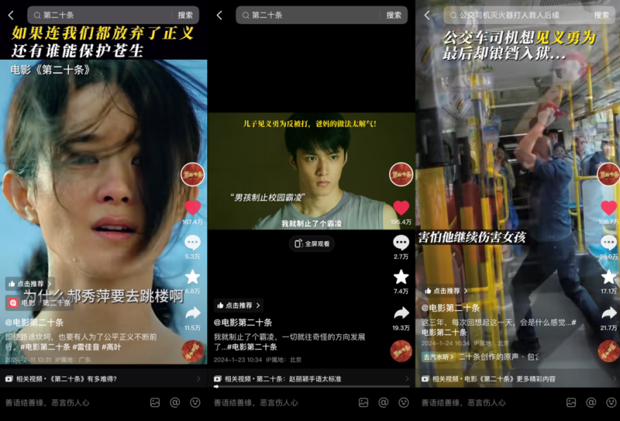 同样,《第二十条》的热议内容中,“郝秀萍对正义的绝望”、“韩明儿子为制止霸凌反被打”、“公交车司机见义勇为被判刑”等片段被广泛讨论,也折射出宣发向内容回归的底层逻辑。即便这些短视频表面呈现出喜感、严肃、写实等多种风格,但都在叩问正当防卫的议题。