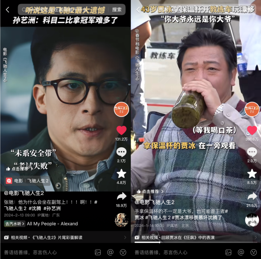 《飞驰人生2》的宣发内容则紧扣喜剧底色。其中,孙艺洲饰演的刘显德夺冠后考不过科目二、贾冰塑造的辛厂长飙车看呆众人等戏剧性片段,都尝试用观众更喜欢的方式,靠拢平台用户和电影潜在受众群。相关作品点赞破百万,也加快了全员喜剧人的多点位爆发。