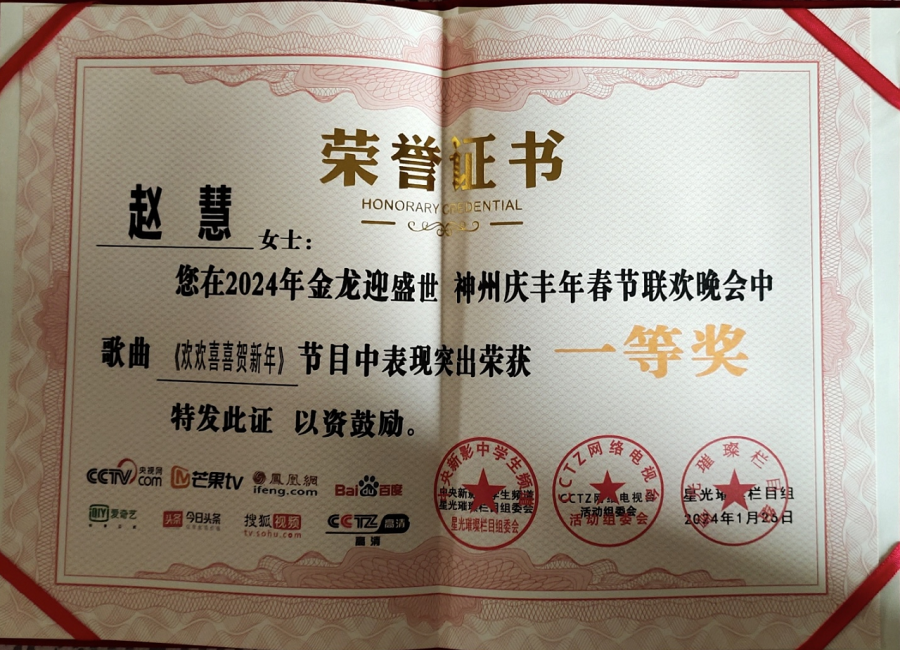 华语女歌手赵慧参加金龙迎盛世神州庆丰年,2024年春节联欢晚会演唱《欢欢喜喜贺新年》荣获一等奖,2024年光影卫视,网络电视台CCTZ播出春节特别节目