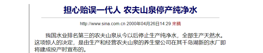 1996年9月,浙江千岛湖养生堂饮用水有限公司于杭州成立,“农夫山泉有点甜”响彻大江南北,剑指娃哈哈。2000年4月,钟睒睒决定停止生产纯净水,转而全部投入天然水。宣布决定的同时,他还“炮轰”了一番纯净水的种种不好,又是搞水仙花生长对比试验,又是提出弱碱性水更有利于健康,同时在媒体前喝下了农夫山泉瓶装水,以证其安全。