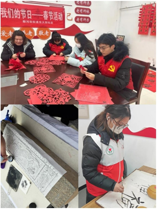 传承中华文化,弘扬传统美德。中华文化源远流长,让中华之美在新时代焕发出新的生命力。该校文化传播学院尤田田同学在寒假期间在河南古籍大会非遗演示的项目做志愿者,了解汉拓有关的知识,体验抄古籍、活字印刷术、造纸术等。宋均钧同学在社区中心写了对联,向社区居民们传递出温暖,送出祝福。不仅宣扬了中华民族优秀的传统文化,也展现了青年投身社会服务大众的新时代风貌,将节日的氛围烘托得越发浓烈。教育科学学院马笑佳同学、文化传播学院濮玉美同学通过家乡共青团报名参加“返家乡”社会实践活动,去传承中国传统文化,助力家乡发展。
