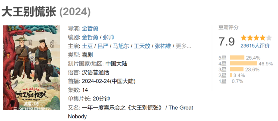作为土豆、吕严的最新合体之作,也是《一年一度喜剧大赛》喜剧人的团建之作,《大王别慌张》融合Sketch、漫才等多种新喜剧形式,在一出极其荒诞的妖界卧底故事中,找到现代职场的现实落点。豆瓣上,网友为该剧打出7.9的高分,站在重构的西游世界里,映射打工人日常的《大王别慌张》显得颇具先锋性。