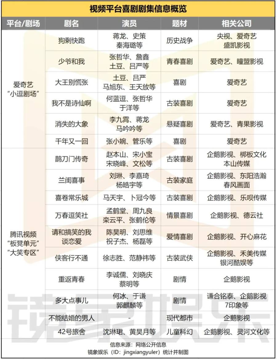不只是爱奇艺的小逗剧场,腾讯视频的板凳单元、及最新片单中独立出来的“大笑专区”,也在深度聚焦喜剧内容,先后向市场输出《鹊刀门传奇》《兰闺喜事》等高分喜剧,最新的动作是,由徐志胜担当主演的《侠客行不通》官宣开机。某种程度上看,如果说悬疑赛道中的迷雾剧场、X剧场等,在各大平台最先跑起来,那么就眼下的发展势头,喜剧赛道中的多个剧场更有可能成为下一个接棒手。