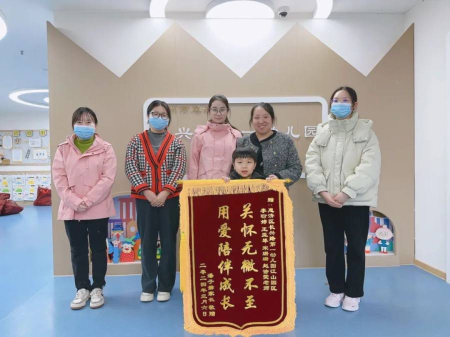 2024年3月8日,大一班潘子赫小朋友的家长将满载感恩之情的锦旗送到班级老师的手中,表达对老师们辛勤教育和悉心照料孩子的感谢之情,简单的字句间流露出真挚的情感与信任,不仅是对幼儿园和老师工作的肯定,也是对家园共育的积极支持。