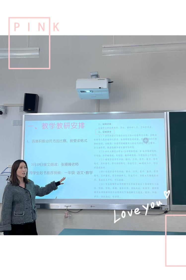 刘钰琪老师对本周及下周的各项学校工作进行了安排。鼓励老师积极参与书法比赛,并做好学生的动员和辅导工作。