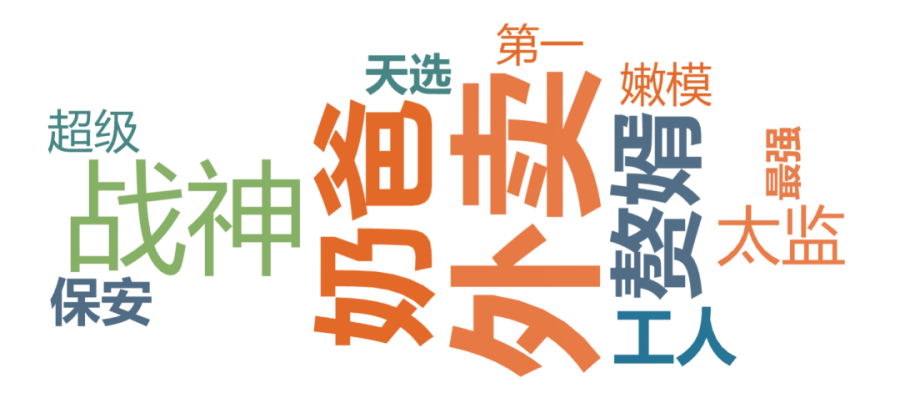 “我”(129部提及,下同)叫郝多余(6)、我爷爷是剑仙(15)、我爸是战皇(17)、赘婿(39)、神豪(49)、九州首富(25),我帮爹地选妈咪(9)。我妈是女王(29)、战神(18)、总裁(53)、世界首富(56)。